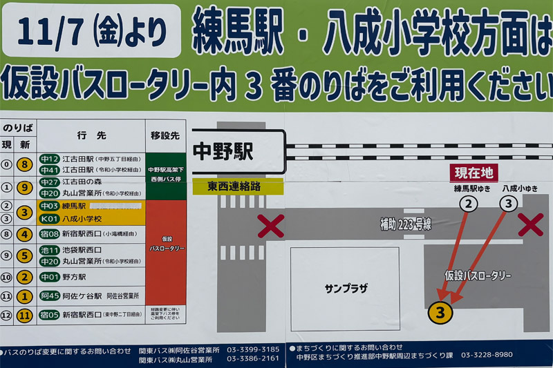 ○ 中野駅北口をサンプラザ方向に進んだ場合、サンプラザ前から西(四季の森公園方向)への道が工事のため通行止めになっており、界隈にあったバス停はおもに四季の森公園方向の隅に集約されている。場所を書くなら、かつて犬屋敷跡地の犬が飾られていたあたり、数年前まで関東バスのブースがあったあたり。