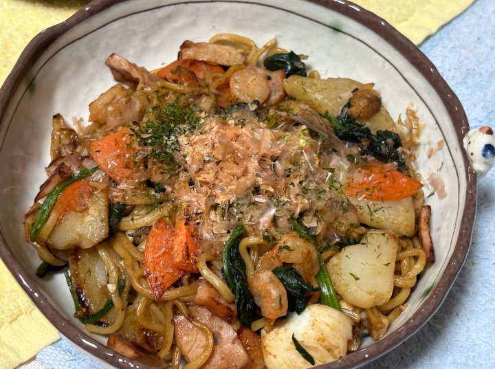 昼にこれを食べた。以前はわたしが田舎を思いだして「こういうのがあるんだよ」と話していただけだが、最近は家族が作ってくれる。北関東の味「ポテト入り焼きそば」であるが、地元の人間は「焼きそば」と言っただけでポテト入りを連想したものだ(いまは知らないが)。